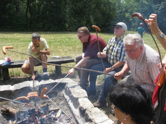 Auf dem Rückweg war das Ziel zunächst ein sehr schön gelegener Grillplatz, wo wir eine Rast einlegten und mitgebrachte Würstchen und Steaks grillten und uns mit Getränken erfrischten. Weiter führte uns der Weg am Albtrauf entlang zu den Höllenlöchern. Inzwischen war ein Gewitter aufgezogen, das uns nicht nur Donner und Blitz, sondern auch einen leichten Regen bescherte. Auf dem letzten Wegstück zurück zu unserem Ausgangspunkt konnten wir nochmals die herrliche Aussicht auf den Albtrauf und die Burg "Hohen Neuffen" genießen. In einer nahegelegenen Bauernwirtschaft ließen wir den Tag bei Kaffee und Kuchen oder einem frischen Bier ausklingen.
