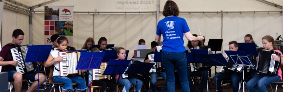 Mehrere Vereine und Gruppierungen nutzten am Sonntagnachmittag die Chance, sich und ihre Jugendarbeit auf der zentralen Bühne zu präsentieren. Wir wurden dabei passend vom Schülerorchester vertreten, das unter der Leitung von Angela Hausenbiegl moderne Akkordeonmusik darbot: rhythmisch, fetzig, … oder einfach cool