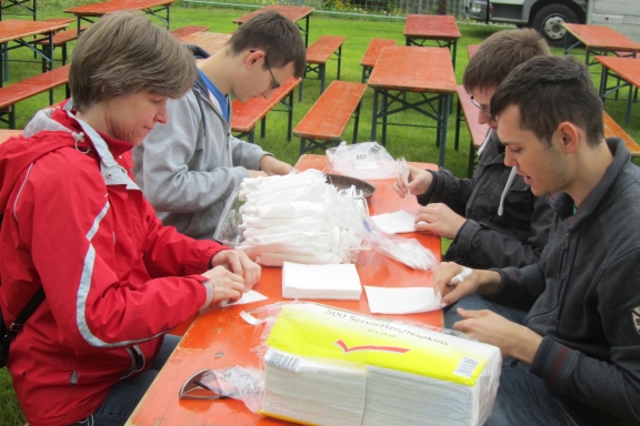 Eine der langwierigsten Aufgaben: für das Einwickeln des Bestecks in die Serviette sind zahlreiche Hilfskräfte erforderlich.