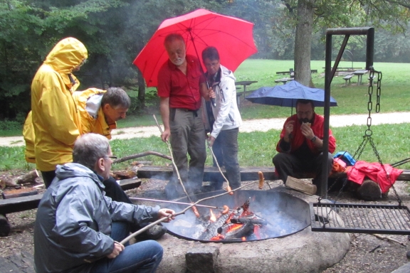 Auch bei Regen kann man eine Wurst am offenen Feuer grillen - man muss sich nur zu helfen wissen.